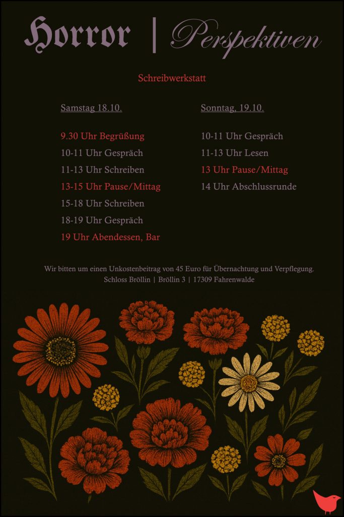 In Zeiten globaler Transformationen stellen sich einmal mehr Fragen nach dem kulturellen Selbstverständnis und der persönlichen Disposition. Das Unbewusste und Verdrängte kommen zurück an die Oberfläche. Im Schreiben liegt das Potenzial, unterschwellige Ängste erfahrbar zu machen. Horror ist als Metapher und Genre das Medium der psychischen Unordnung, des seelischen Ausnahmezustands, der sinnlichen Überwältigung, der körperlichen Affektion. Die Angst darin kann einen Prozess hin zur Veränderung initialisieren. Horror ist auch eine Frage der Perspektive, wie wir uns als Einzelne positionieren, wohin wir schauen wollen. Auf uns selbst, unser Gegenüber, die Welt.