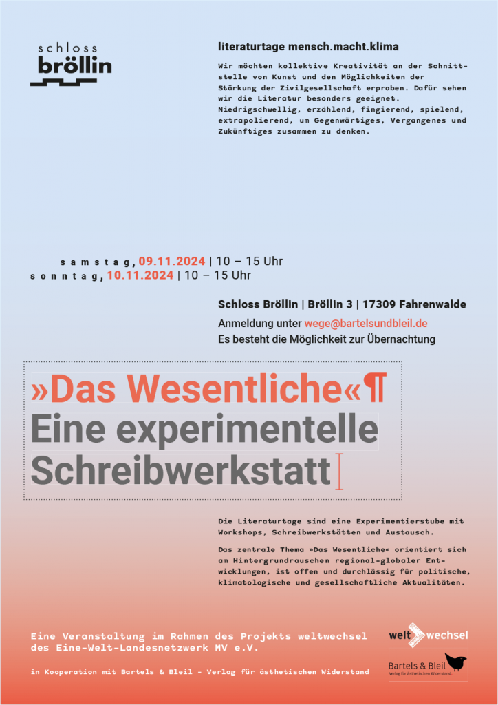 Angesichts der Ereignisse des Jahres 2024 als eines der kommenden und bereits vollzogenen Umbrüche, ob politisch, kulturell oder klimatologisch, ist es wichtig, jetzt in ein Handeln zu kommen, das den persönlichen sowie den kulturell geprägten Willen der Zivilgesellschaft zeigt. Und sich den Herausforderungen und/oder Zumutungen der Gegenwart zu stellen bereit ist. Regional, global, universal. Die Literaturtage auf Schloss Bröllin sind praktisch eine Experimentierstube. Das Gespräch und das Miteinander, die Begegnung und der Austausch stehen im Vordergrund.